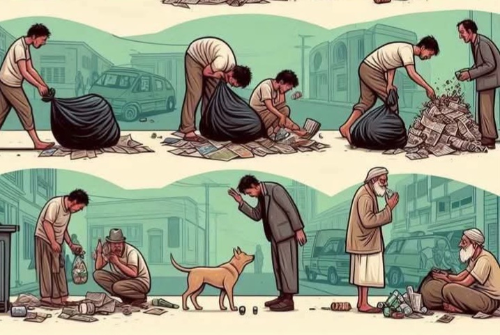 சிறிது நேரத்தில் இன்னொரு நபர் அதே குப்பைத் தொட்டியில் தனக்குத் தேவையான பாட்டில்களை நிரப்பி எடுத்துச் சென்றார். மீண்டும் ஒருவர் தனக்குத் தேவையான பழைய பிளாஸ்டிக் தட்டு, பேப்பரை எடுத்து சாக்கில் நிரப்பிச் சென்றார். அதன்பின் ஒரு நாய் வந்து எச்சில் இலையில் இருந்த சாப்பாட்டை சாப்பிட்டுச் சென்றது.