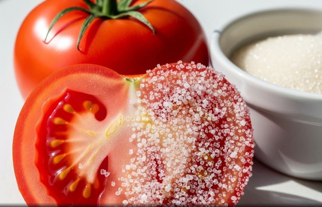 ஒரு நல்ல பழுத்த தக்காளிப் பழத்தை எடுத்துக்கோங்க. அதை அழகா, பாதியா வெட்டிக்கோங்க. அப்புறம், அந்த வெட்டுன பாகம் மேல கொஞ்சமா சர்க்கரையை ‘ தூவி விடுங்க.
