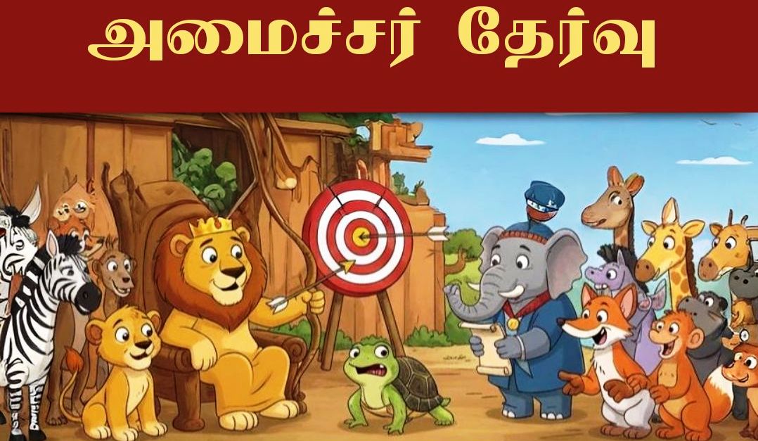 இத கேட்ட வயசான சிங்க ராஜா புது மந்திரி தேர்வு செய்ய எல்லா மிருகங்களையும் கூப்பிட்டாரு ,அரசரோட அறிவிப்பு வந்ததும் மந்திரி தேர்வுக்கு ஆச பட்ட எல்லா மிருகங்களும் அங்க வந்து வரிசையா நின்னுச்சுங்க