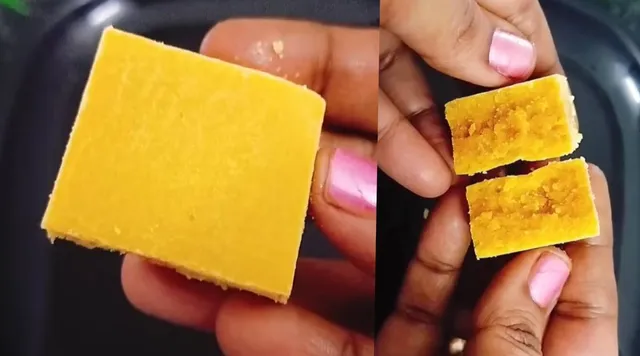 பின்னர் இதை ஒரு நெய் தடவிய பாத்திரத்தில் ஊற்றி ஆறிய பின்பு சிறு சிறு துண்டுகளாக வெட்டி பரிமாறிக் கொள்ளலாம்.