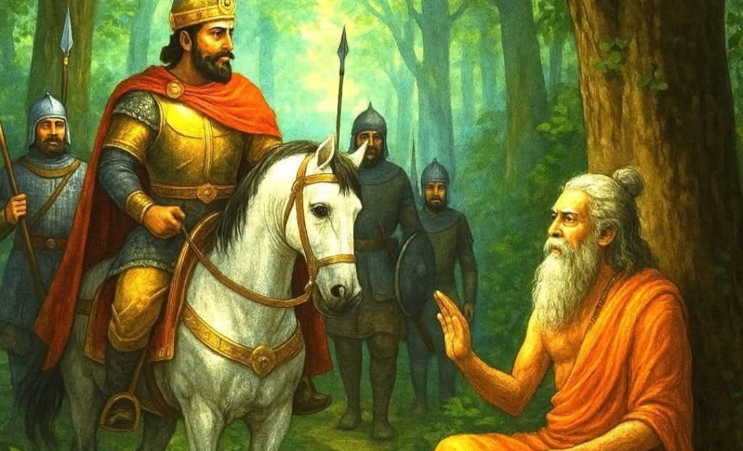 மன்னரும் படை, பட்டாளத்துடன் காடு வந்து சேர்ந்தார். காட்டிற்குள் வேட்டைக்கு சென்ற மன்னர், அங்கிருந்த மரத்தடியில் இருந்த ஒரு முனிவரைப் பார்த்தார்.