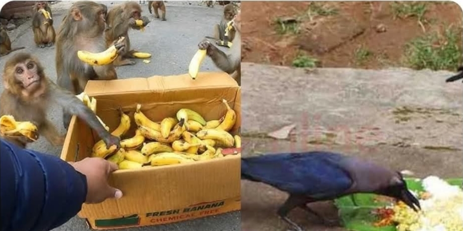 குரங்குகளுக்கு உணவளித்து வந்தால், அகால மரணம், விபத்துக்கள் நேராது. நாய்களுக்கு உணவளித்து வந்தால், நவகிரக தோஷம் நீங்கும். நம் வாழ்வில் உண்டாகும் தடைகளும், துன்பங்களும் நீங்கும் என்று சொல்லப்படுகிறது.